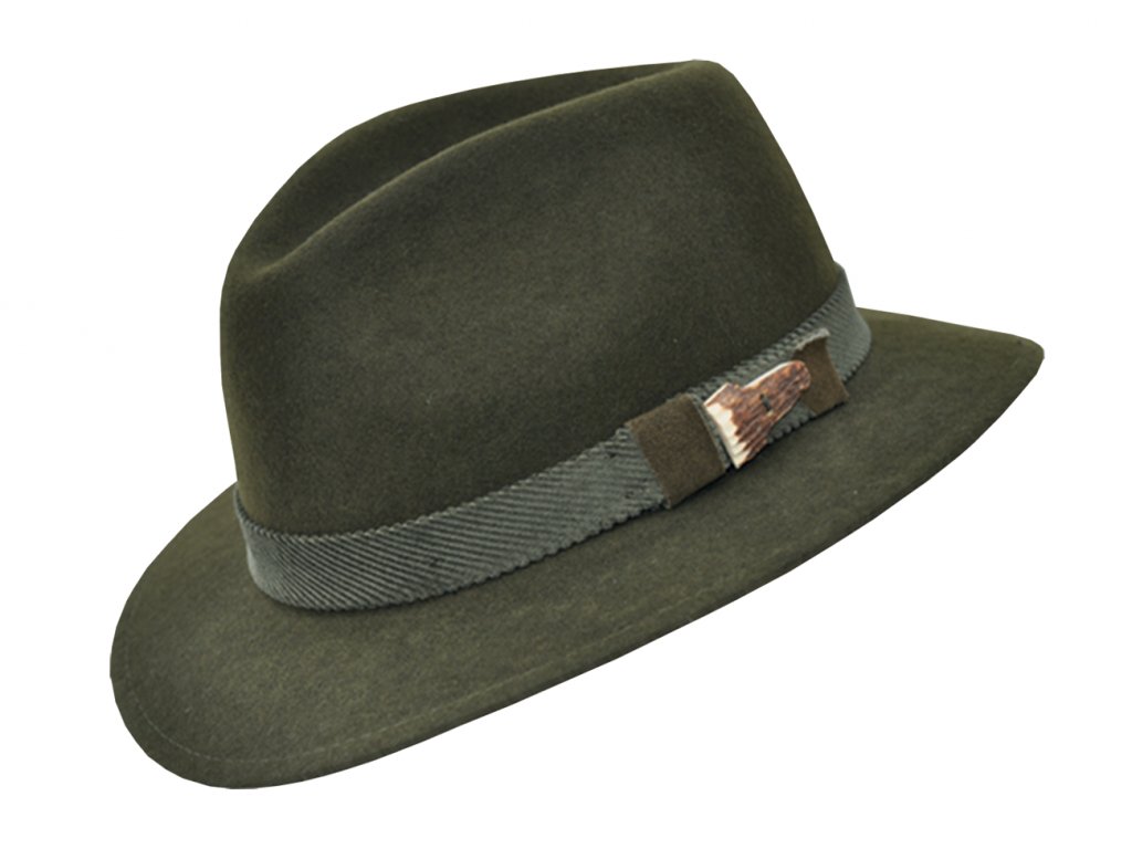 Myslivecký klobouk André, 100% vlněná plsť, zdobený textilním páskem s rastrovaným dezénem a kostěným knoflíkem z parohoviny, textilní potní pásek Werra Hunting.